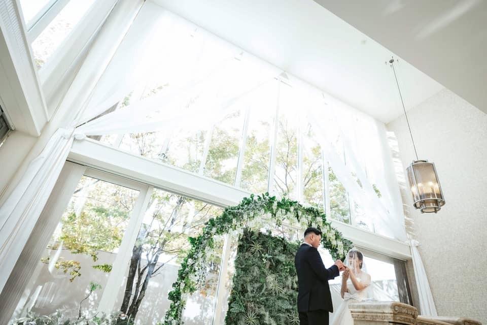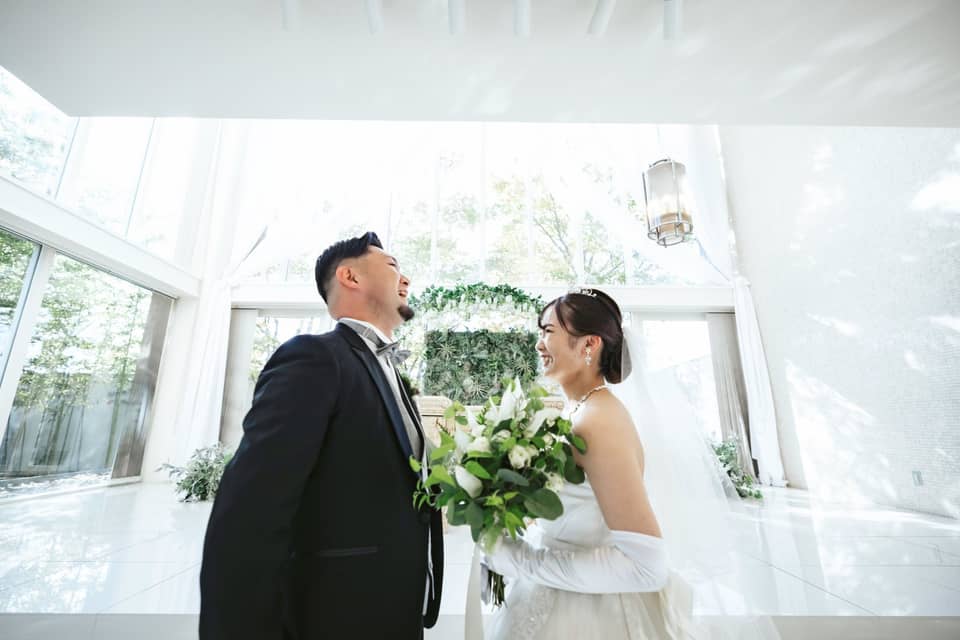 純白×自然×光は、花嫁姿をより引き立てる3大要素。吹き抜けの天井から差し込む陽光とゲストの祝福を感じながらの本格派ウェディングを実現。
